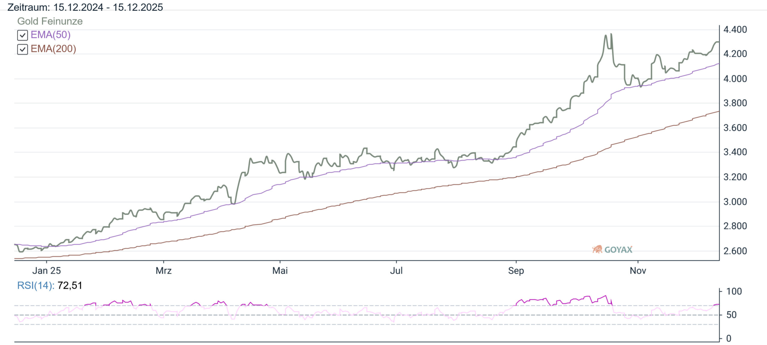 Das dämpft natürlich den Preisanstieg der Feinunze Gold im Euroraum gegenüber dem auf USD Basis ab. Und so ist im Euroraum nach der KW 50 2025 Gold auf Wochensicht von 3.602,39 EUR auf 3.663,89 EUR gestiegen. Also lediglich ein Preisanstieg von 61,50 EUR (+ 1,71 %).