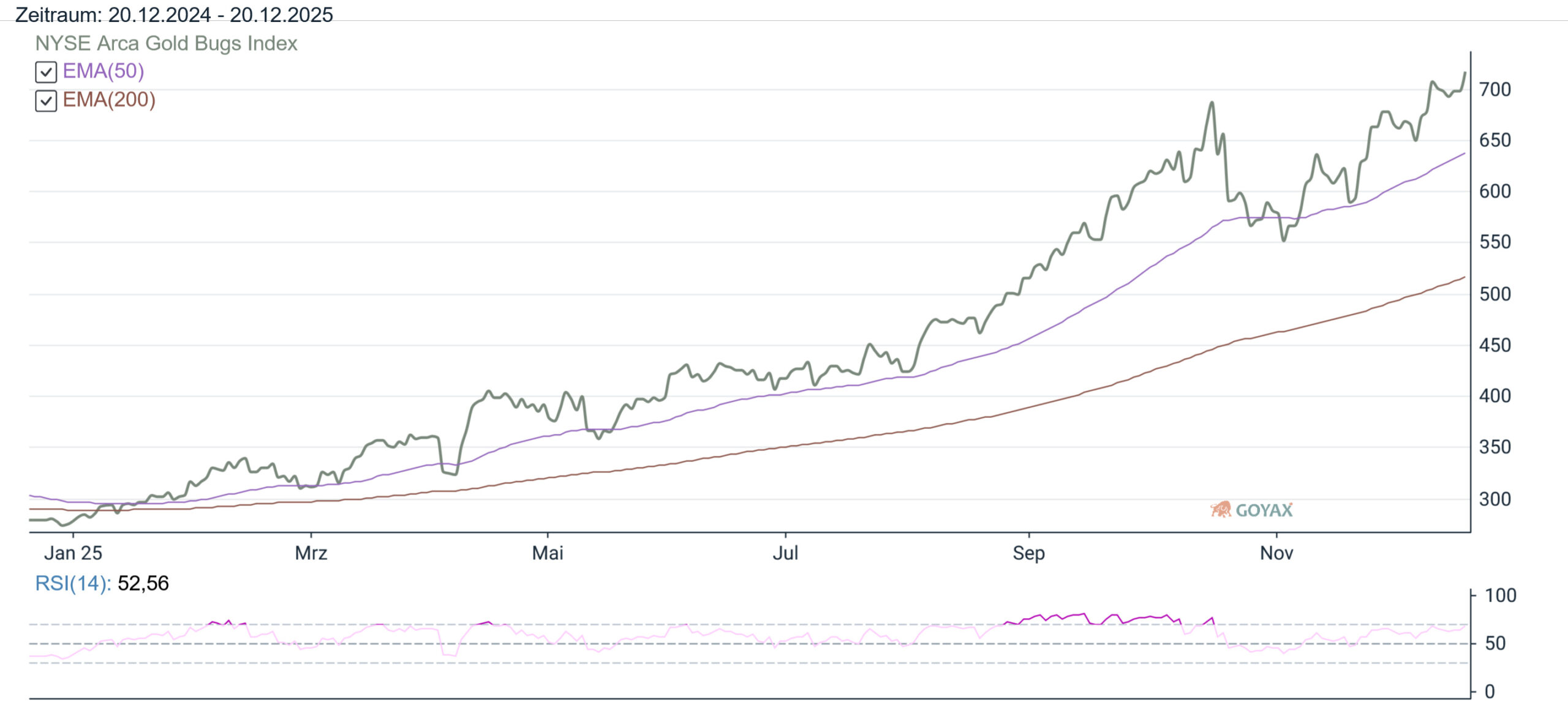 In der KW 51 2025 konnte der NYSE Arca Gold BUGS Index (HUI) zum Wochenschluss seine 700 Punkte Marke behaupten. Im Handelsverlauf immer wieder unterhalb der Marke. Das Wochentief markiert am Dienstag bei 685,98. Aber zum Wochenschluss dann bei 717,11 und damit 16,2 Punkte höher als letztes Wochenende (700,91). Das bedeutet einen Zuwachs von 2,31%.