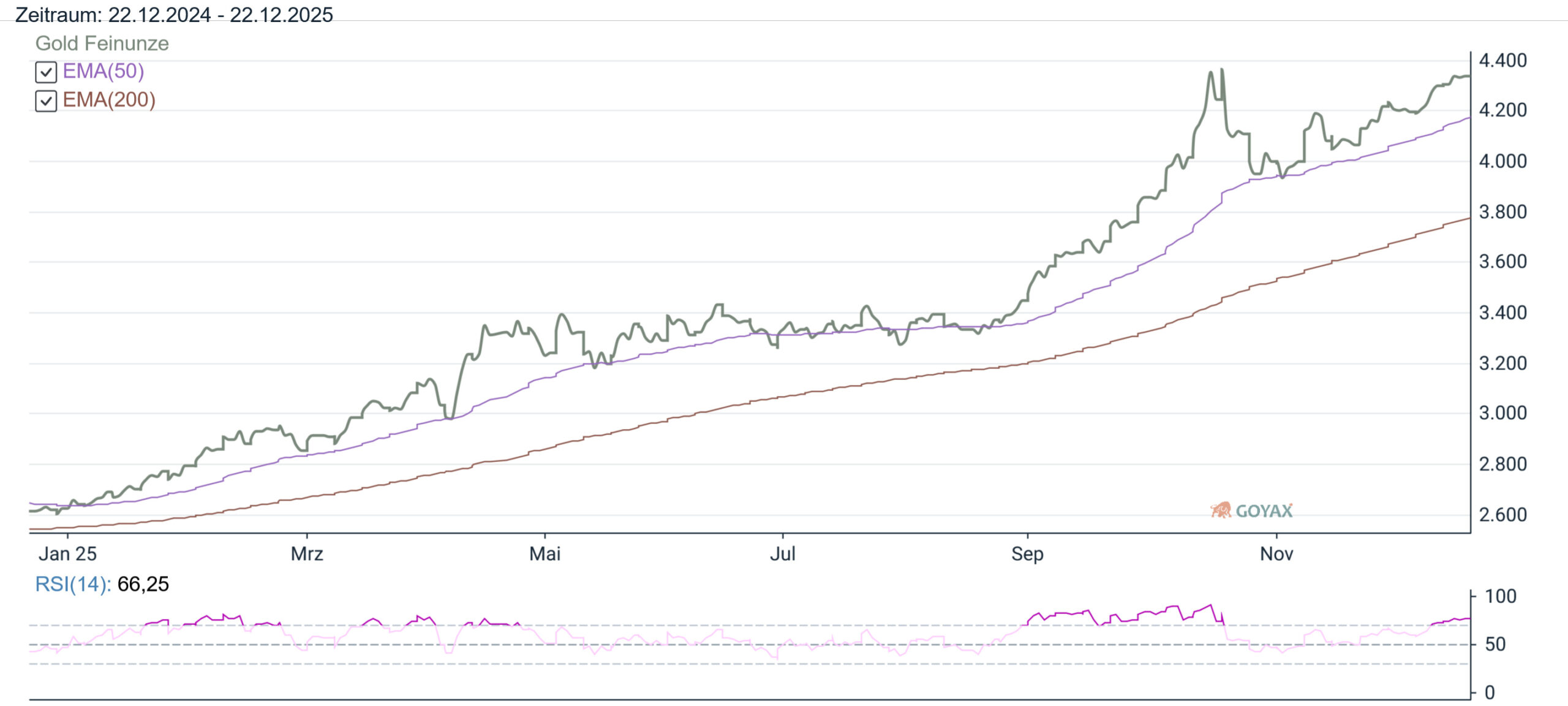 Aus technischer Sicht mehren sich jedoch Hinweise auf eine kurzfristige Überhitzung. Der Abstand zu wichtigen gleitenden Durchschnitten (EMA 50 bei 4.174,17 USD teilweise 200 USD entfernt) ist deutlich angewachsen, was eine Konsolidierung wahrscheinlich macht. Auffällig bleibt, dass der jüngste Anstieg nicht von exzessiver Spekulation begleitet wurde. Daten aus dem Terminmarkt zeigen ein vergleichsweise ausgewogenes Engagement, während ETF-Zuflüsse nur schrittweise zunehmen. Selbst steigende Margin-Anforderungen konnten den Trend bislang nicht bremsen – ein Indiz für strukturelle Stärke im Goldmarkt.